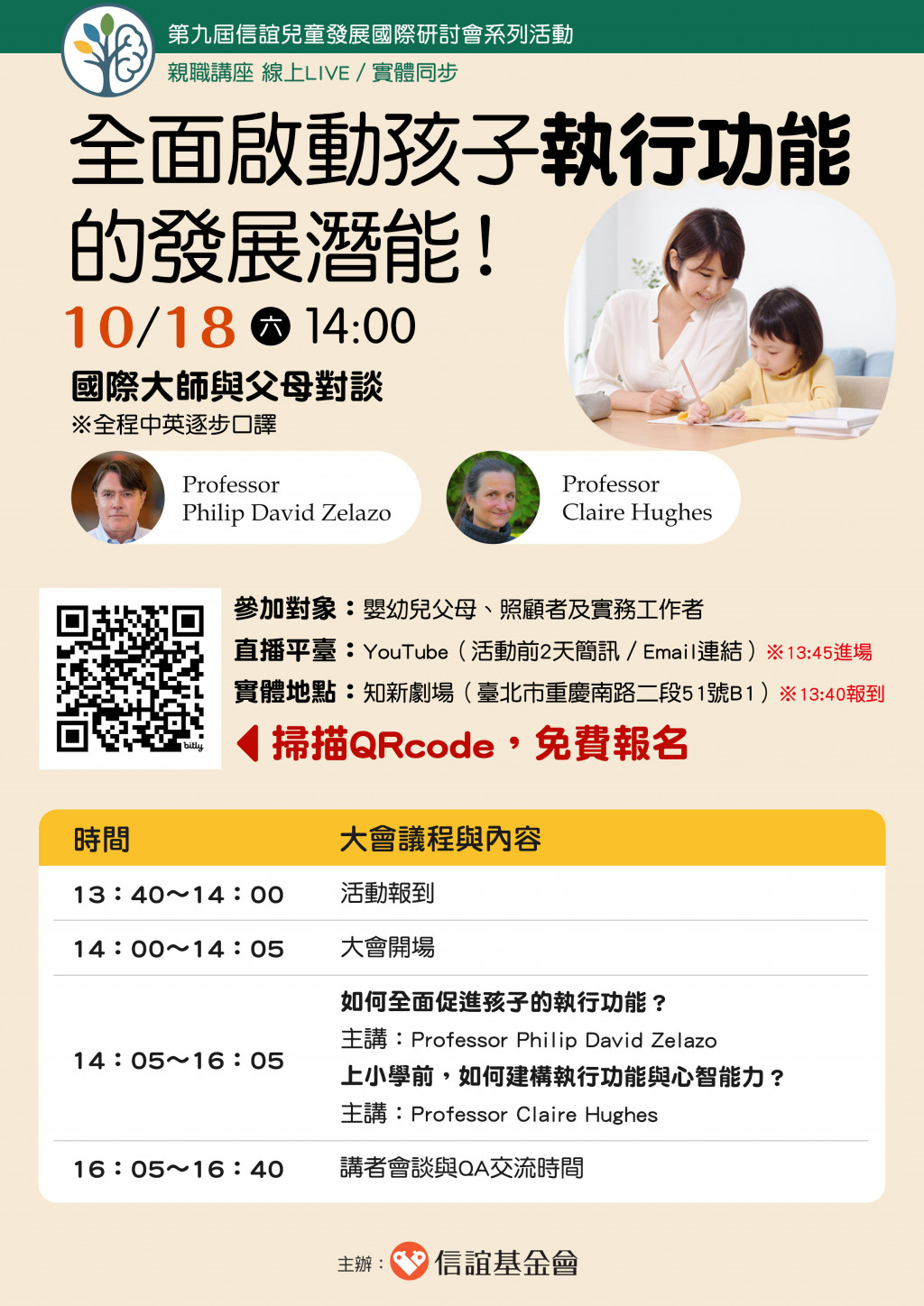 了解孩子的執行功能發展脈絡,就像握有一把開啟未來成長學習能力的鑰匙。第九屆信誼兒童發展國際研討會親職講座特別邀請長期投入幼兒執行功能研究國際權威學者Professor Philip David Zelazo及Professor Claire Hughes主講,全程中英逐步口譯,內容涵蓋執行功能的發展軌跡、影響面向及教養日常的培養與強化策略。