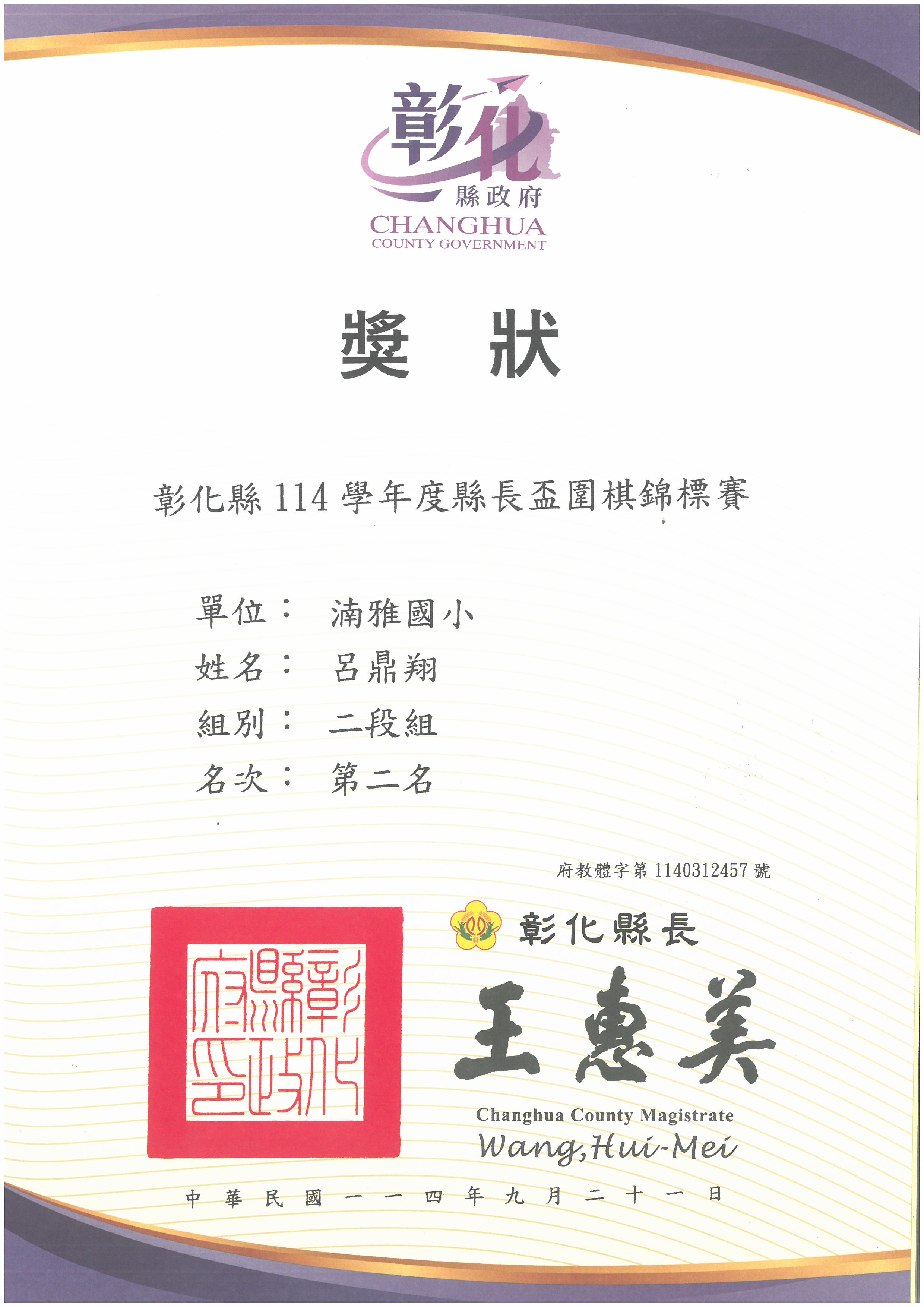 賀!六甲呂鼎翔同學參加彰化縣縣長盃圍棋比賽榮獲二段組第二名
