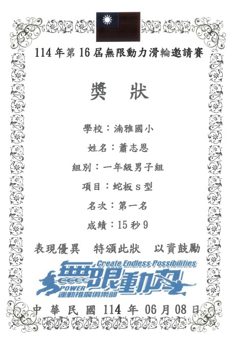 賀!本校一甲蕭至恩同學,參加114年第16屆無限動力滑輪邀請賽,榮獲一年級男子組蛇板S型第一名。
