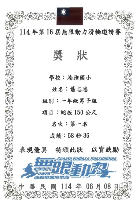 賀!本校一甲蕭至恩同學,參加114年第16屆無限動力滑輪邀請賽,榮獲一年級男子組蛇板150公尺第一名。