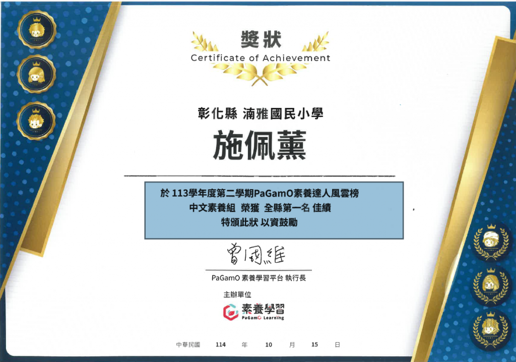 113學年度第二學期PaGamO素養達人風雲榜 中文素養組 榮獲 全縣第一名 佳績