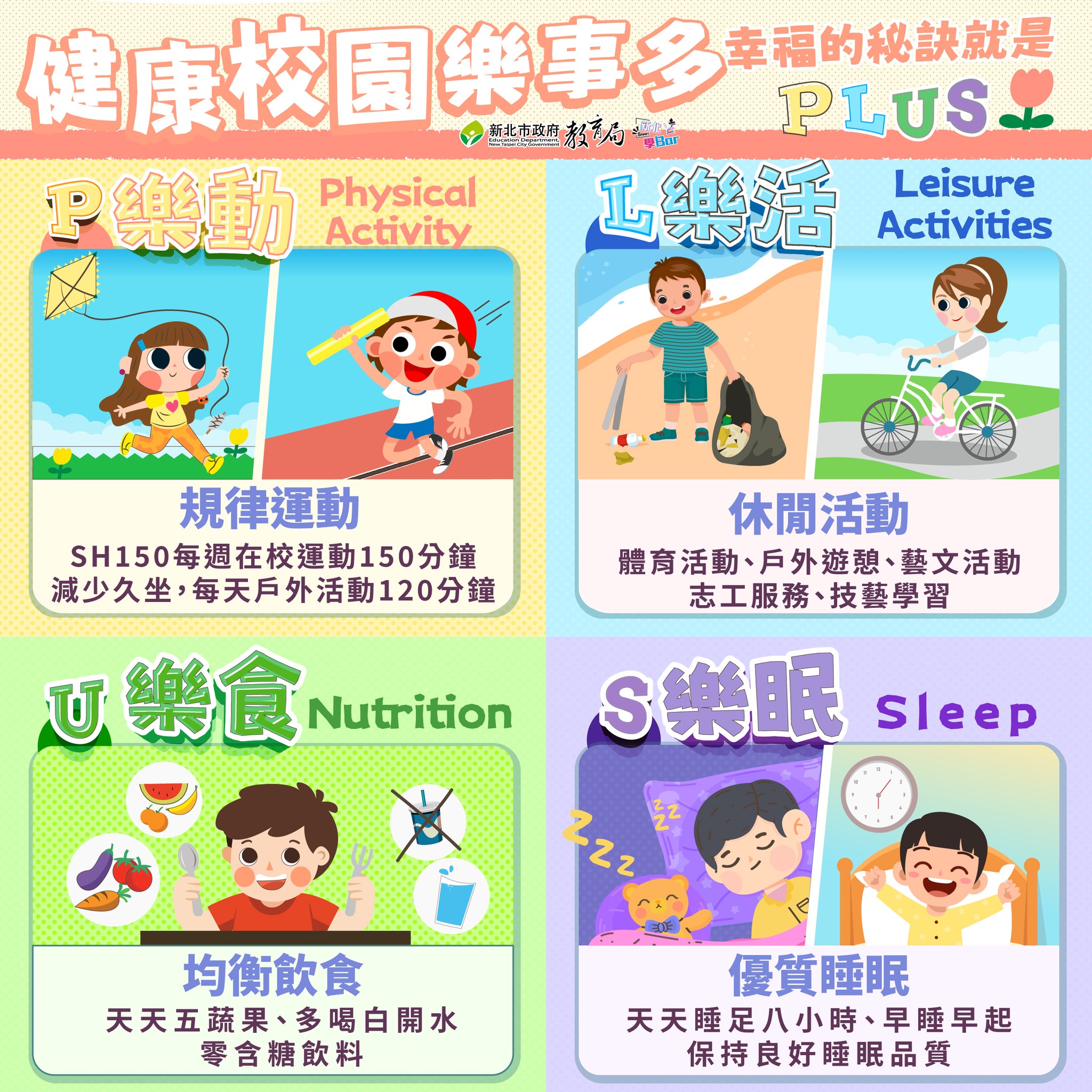 健康校園「PLUS快樂學習」:Physical activity 樂動,養成規律運動的習慣,正確掌握健走與跑步的技巧,有助於身心健康與快樂學習。