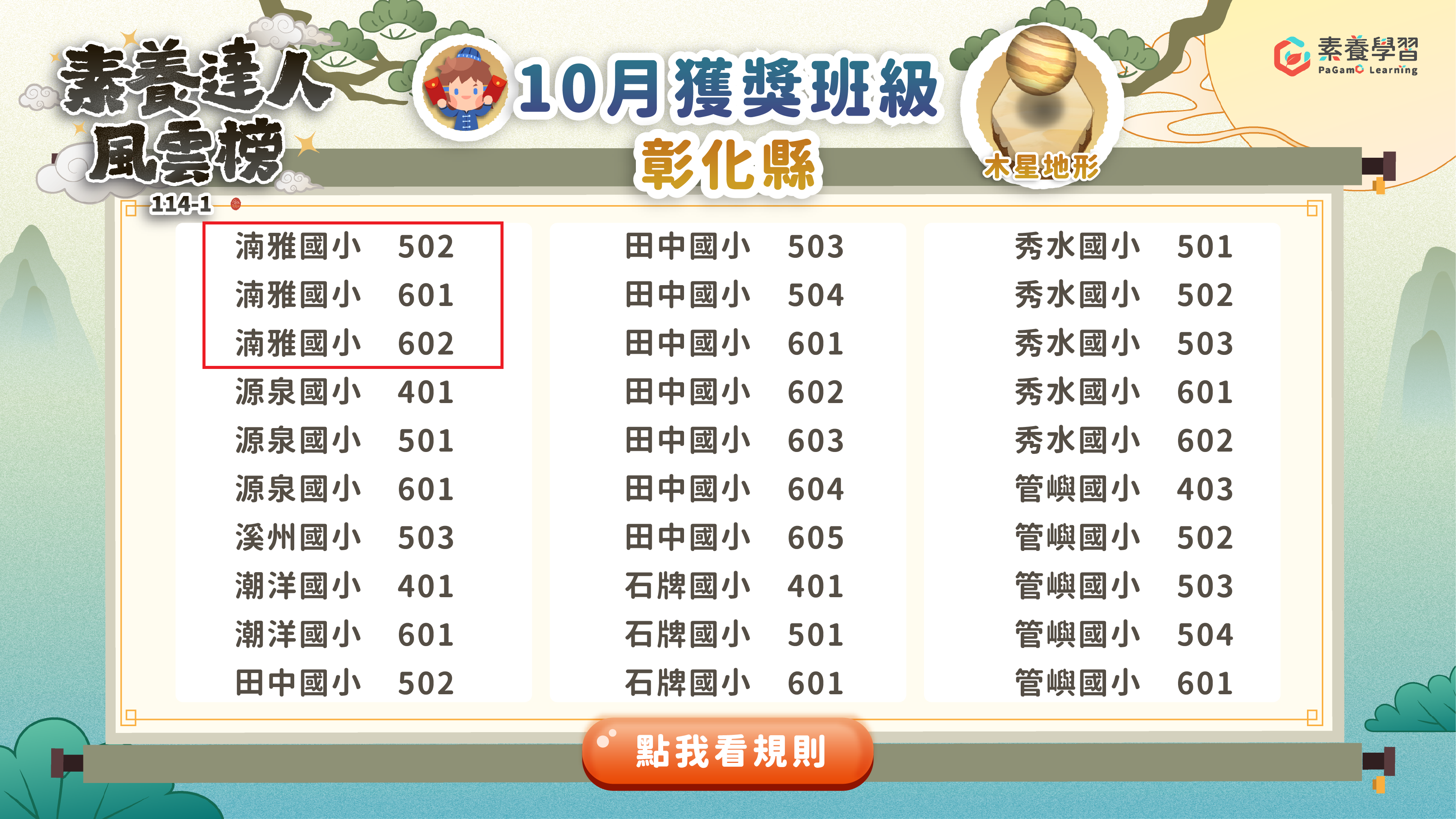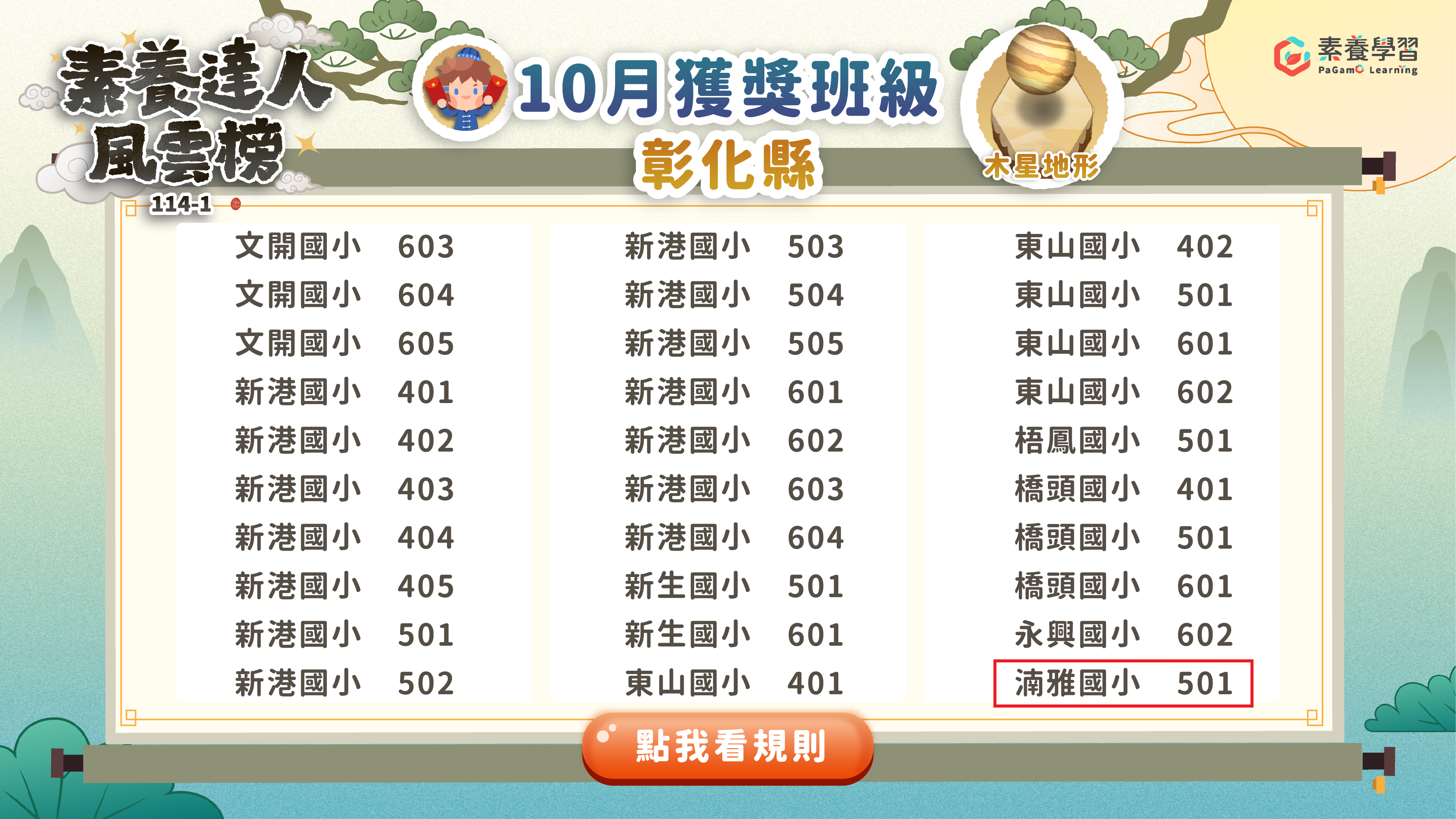 賀!本校 五年甲班 五年乙班 六年甲班 六年乙班 進入彰化縣PaGamO素養達人風雲榜 114年度10月中文榜單