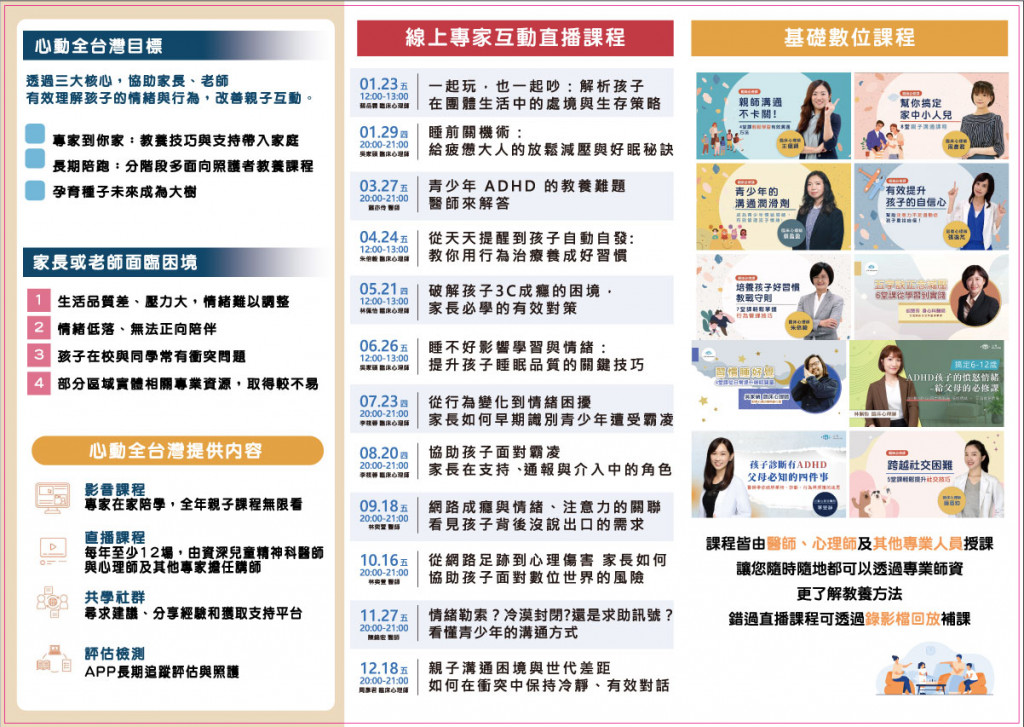本會辦理「離島偏鄉情緒行為發展弱勢兒童數位家庭賦能計畫-心動全台灣」(方案推展期間:115/1/1-115/12/31),旨在提升離島及非六都地區之資源不足地區,協助照顧者透過專業親職賦能數位課程,提升照護注意力不足過動疾患(ADHD)等情緒行為發展弱勢兒童的能力,敬請貴單位協助公告並轉介符合需求之家長、照顧者、及教師等專業人員參與,讓有興趣參與之照顧者及專業人員更了解此方案之課程內容與進行方式。 |