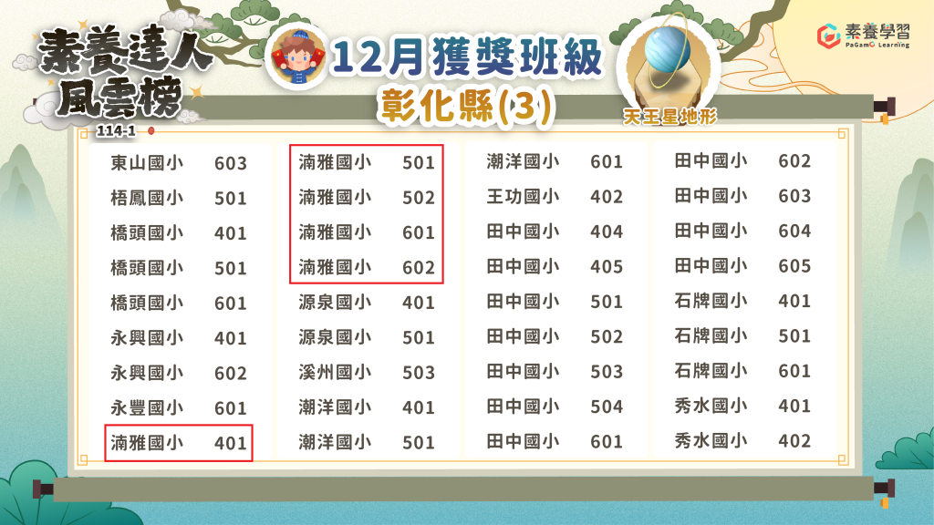 賀!本校 四年甲班、五年甲班、 五年乙班、 六年甲班、 六年乙班、 進入彰化縣PaGamO素養達人風雲榜 114年度12月中文榜單。