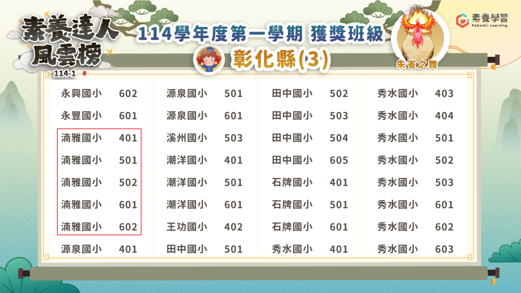賀!本校 四年甲班、五年甲班、 五年乙班、 六年甲班、 六年乙班、 進入彰化縣PaGamO素養達人風雲榜 114學年度第一學期榜單。