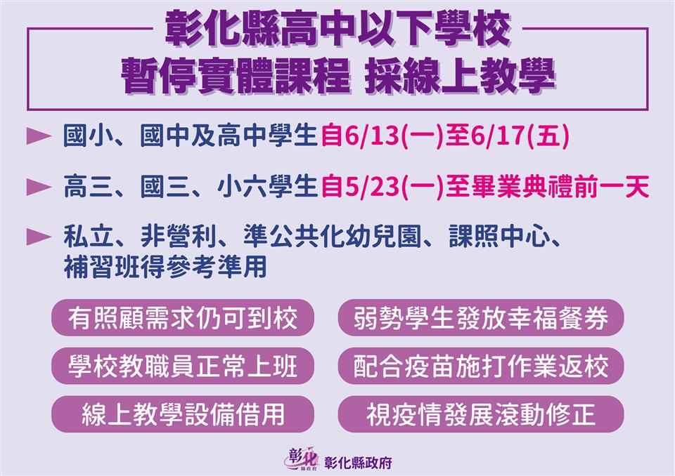 彰化縣高級中等以下學校(含國小附幼、鄉鎮市幼兒園)改遠距教學模式授課再延長一週,從6月13日(ㄧ)至6月17日(五)。