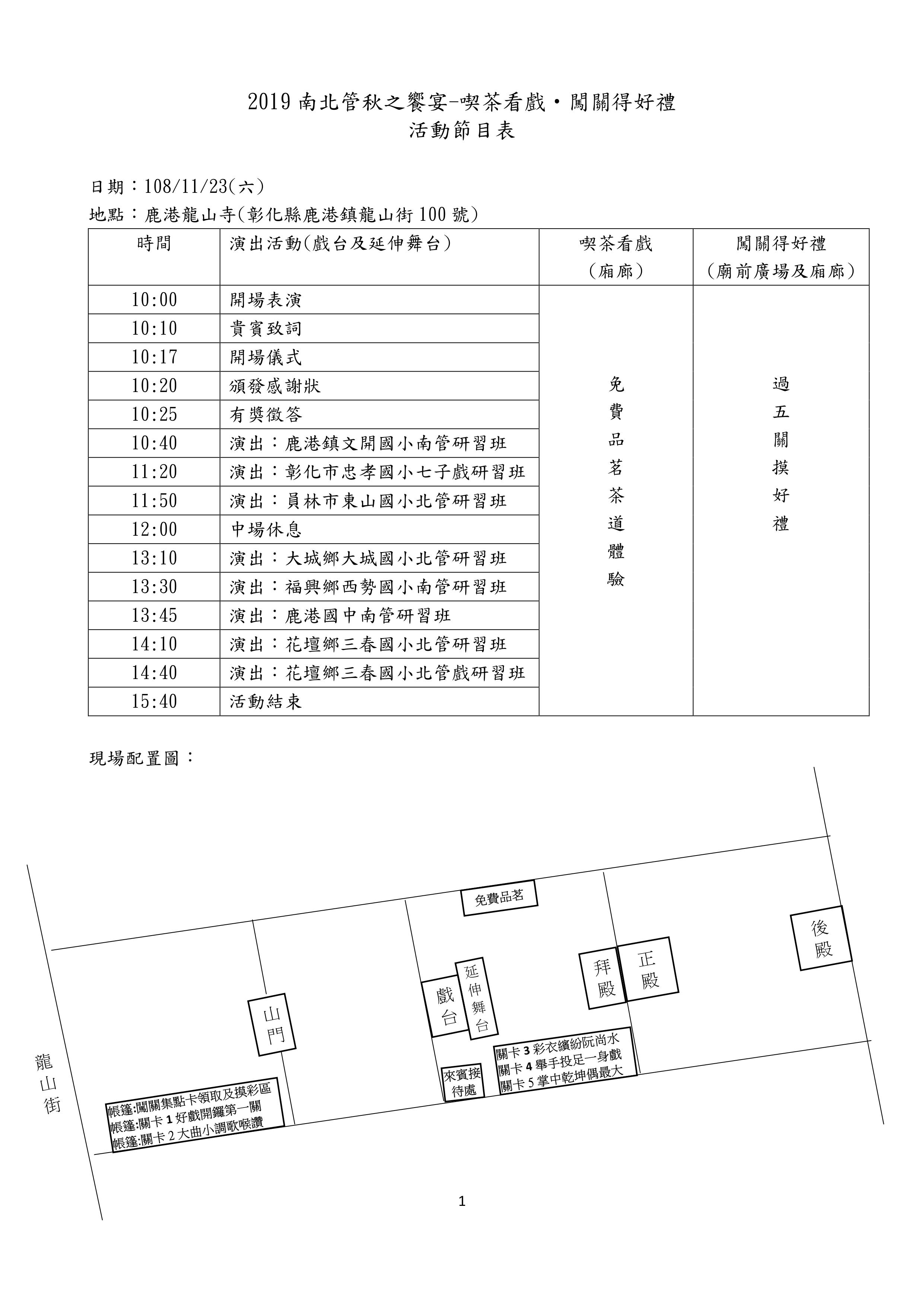 二、本項活動謹訂於108年11月23日(星期六)上午10時至下午3時40分於鹿港龍山寺舉行,尚有免費品茗茶道體驗及闖關遊戲得好禮活動同步進行。
