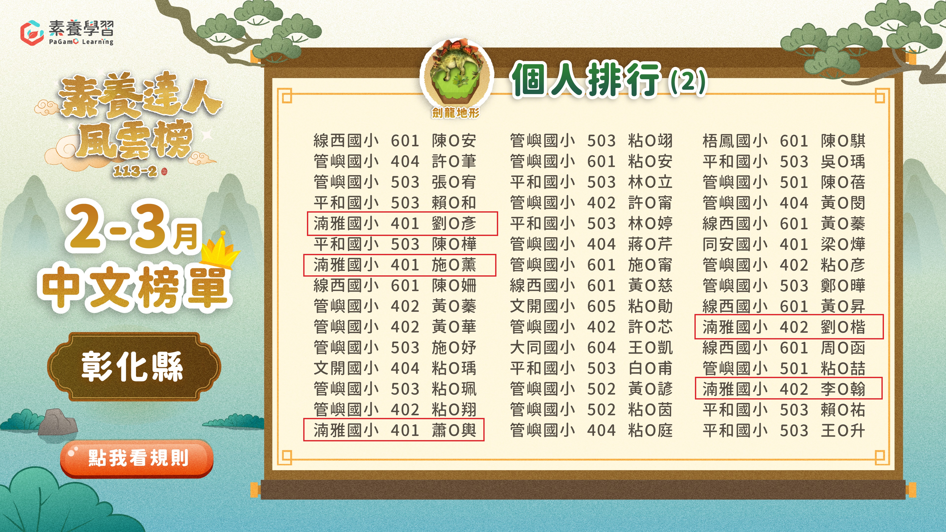 恭喜 四年甲班 劉柏彥同學進入 PaGamO 114年2-3月 中文素養 排行榜!